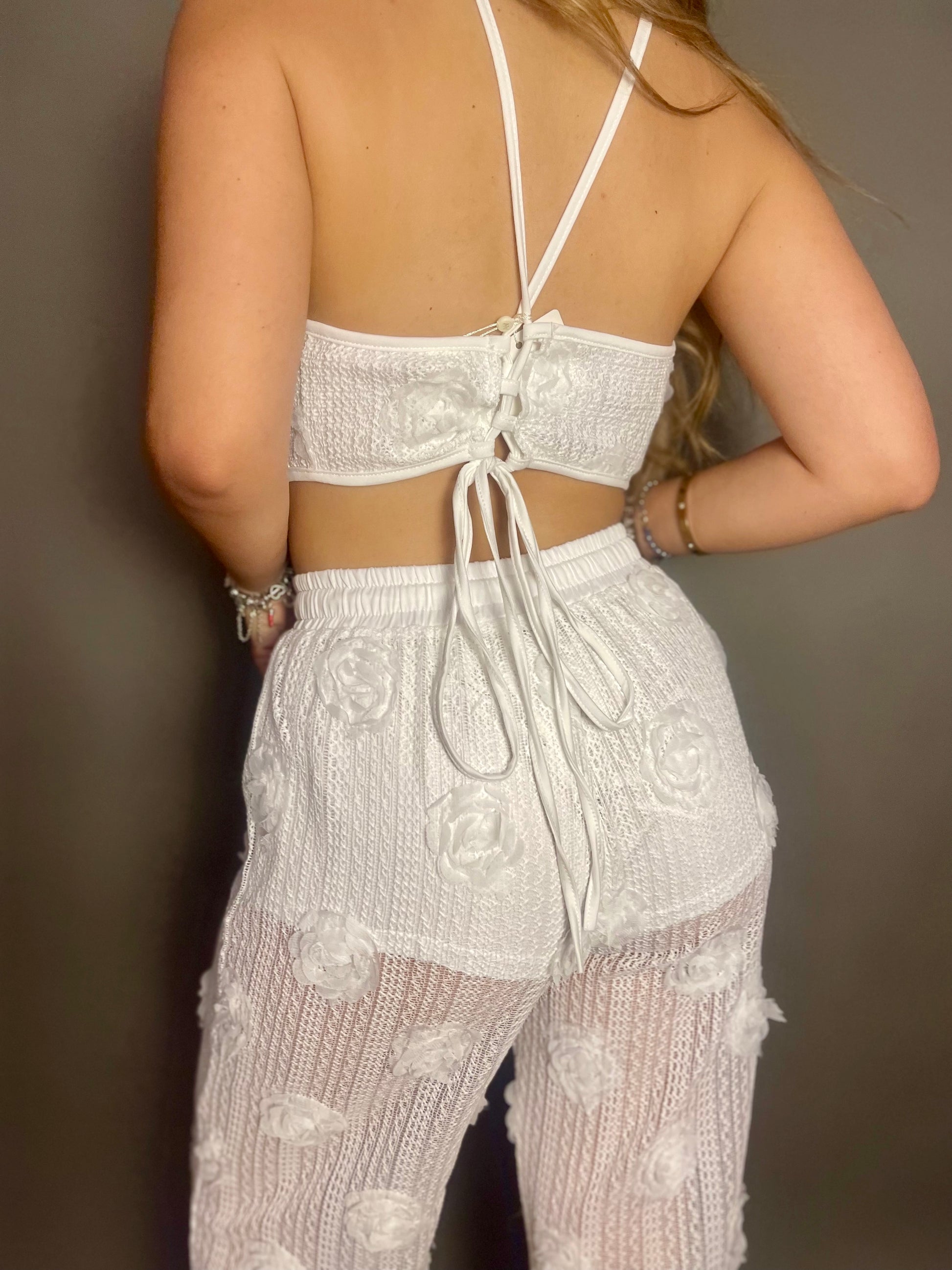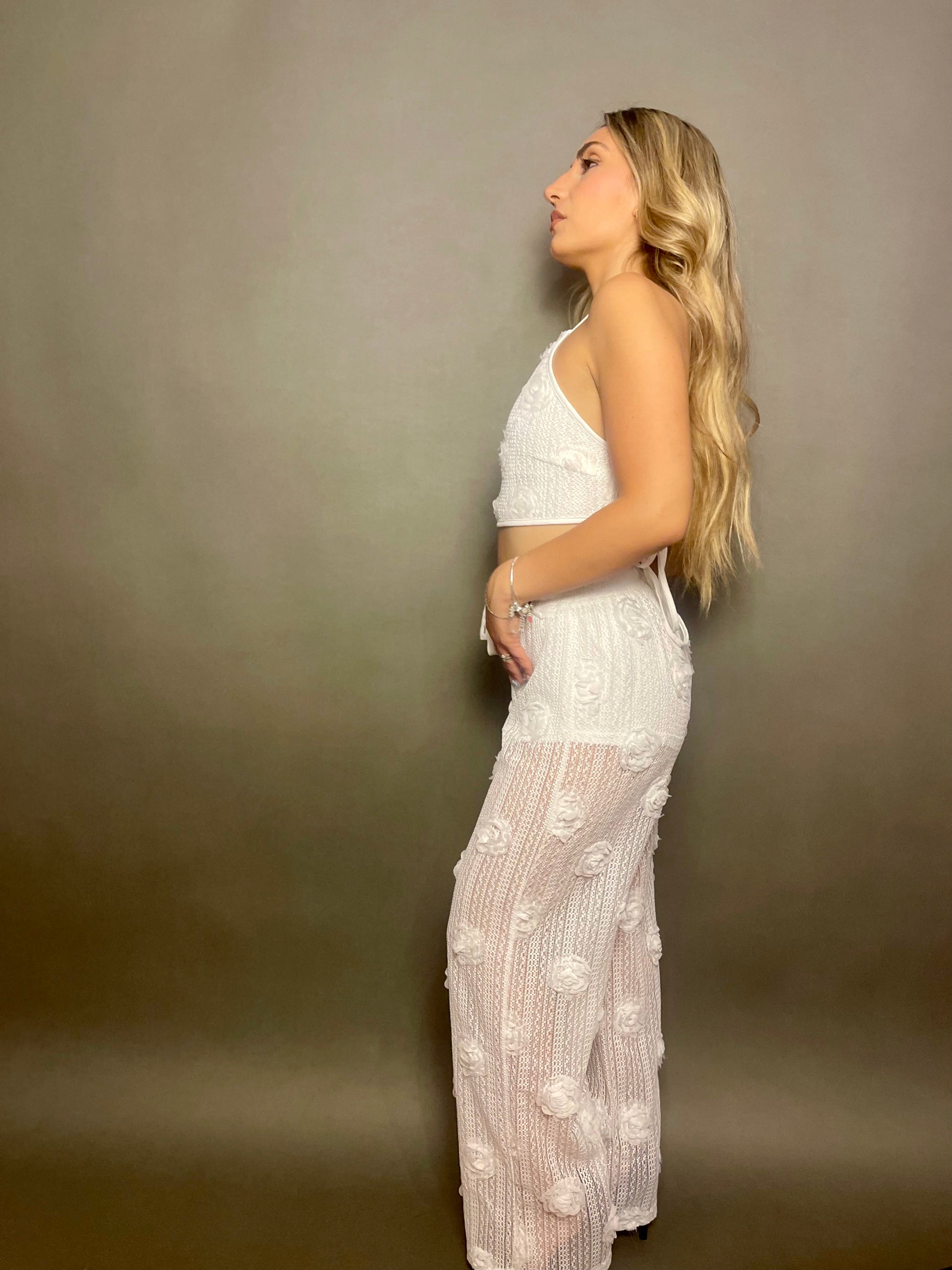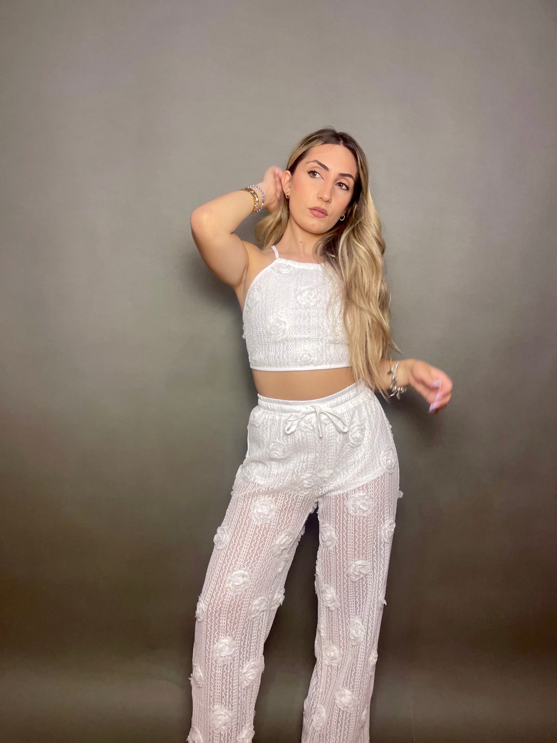 Coordinato composto da Pantalone ricamato con fiori e top con incrocio posteriore ricamato con fiori.
