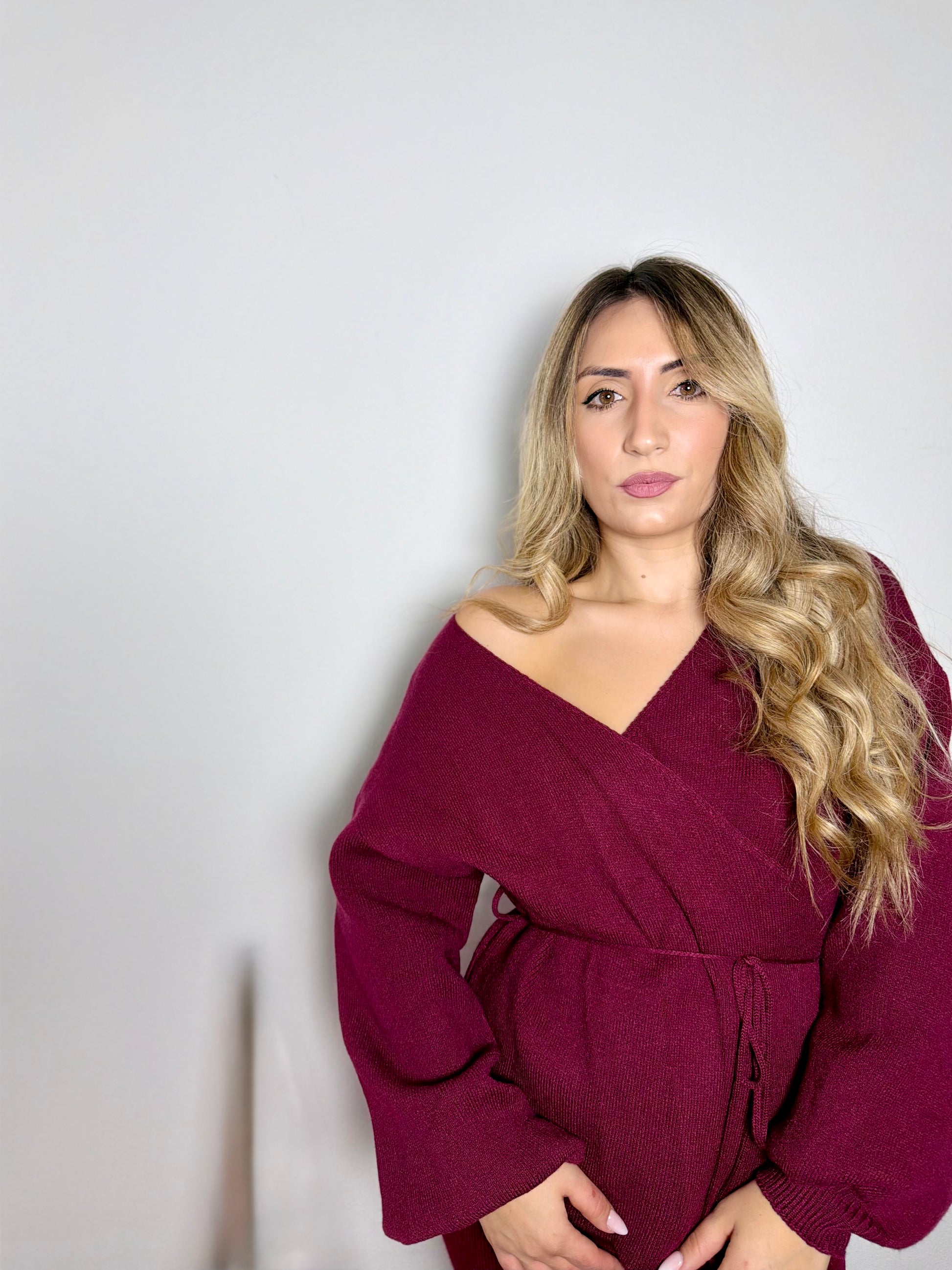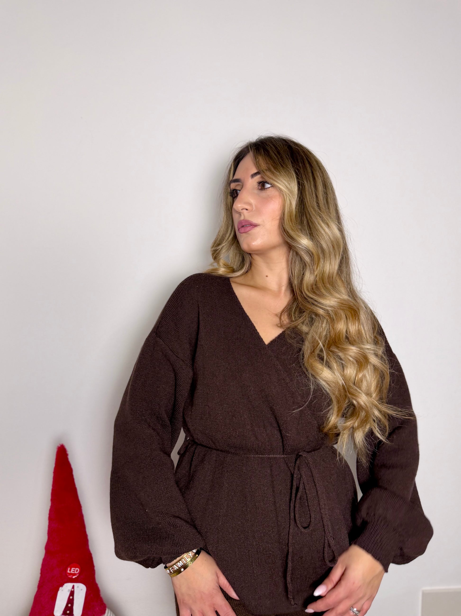 Maglione ad incrocio con cinturina esterna e maniche a palloncino.