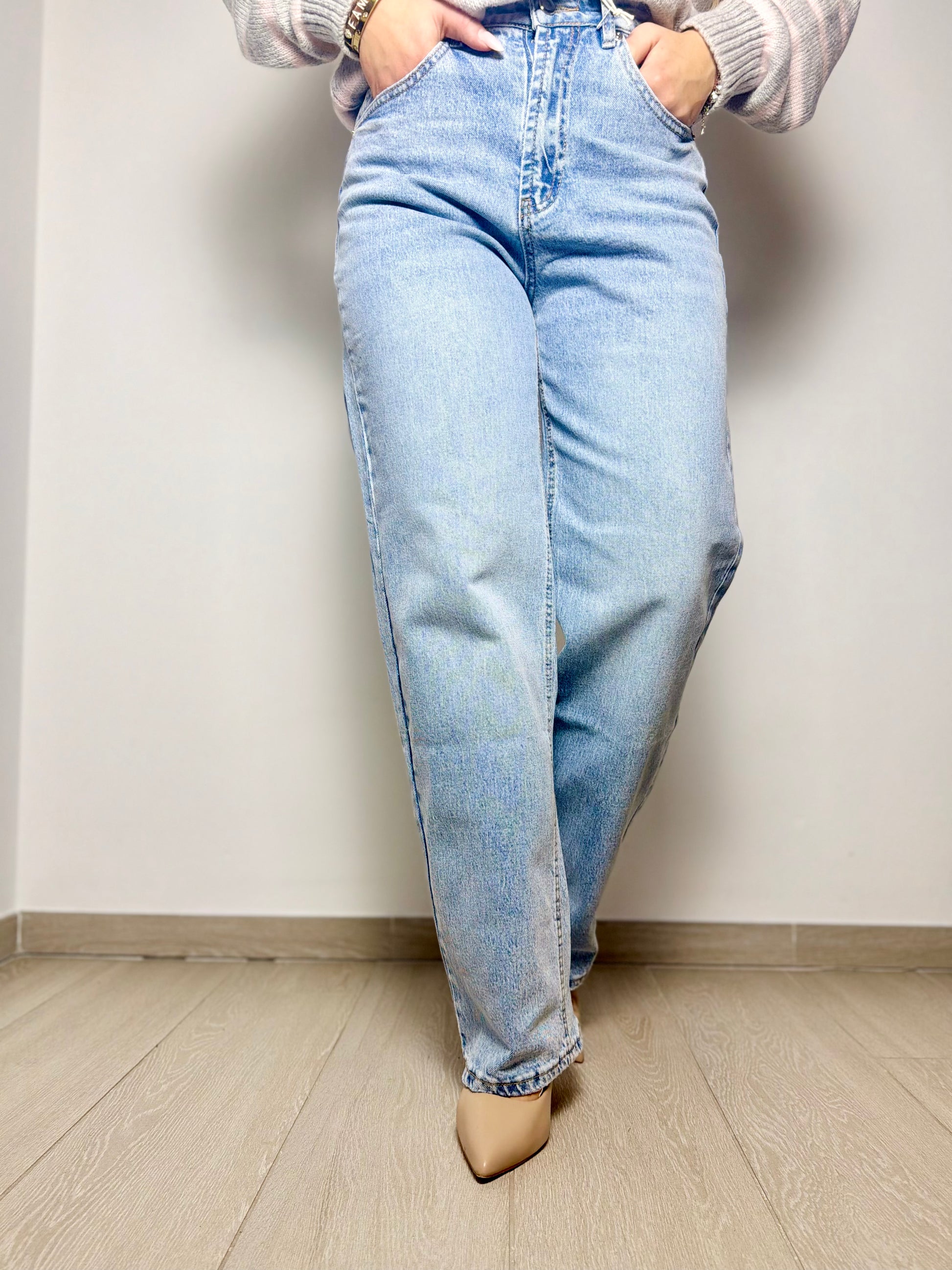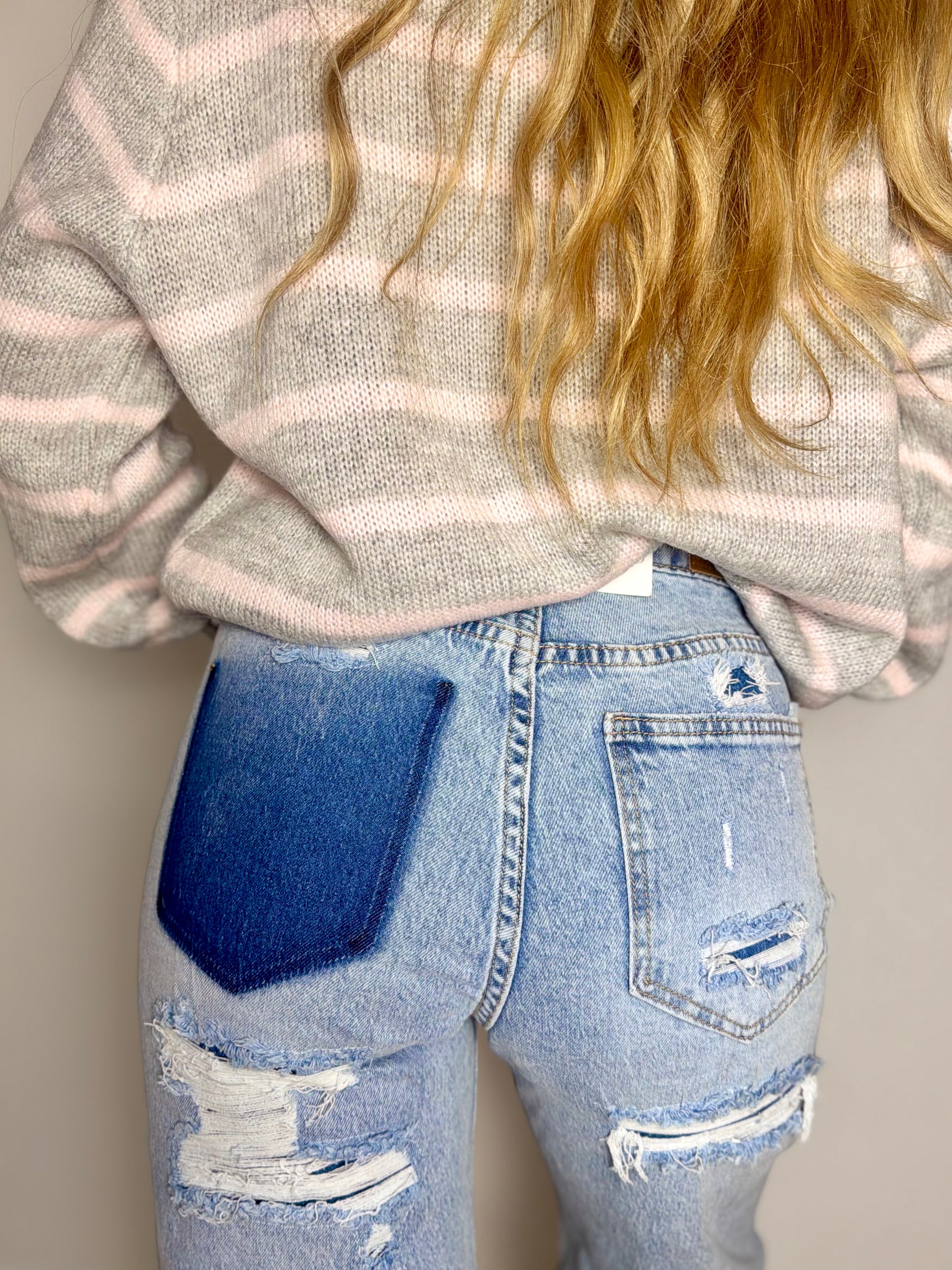 jeans gamba dritta, vita medio alta, sul retro porta il disegno di una tasca con dettagli strappo.