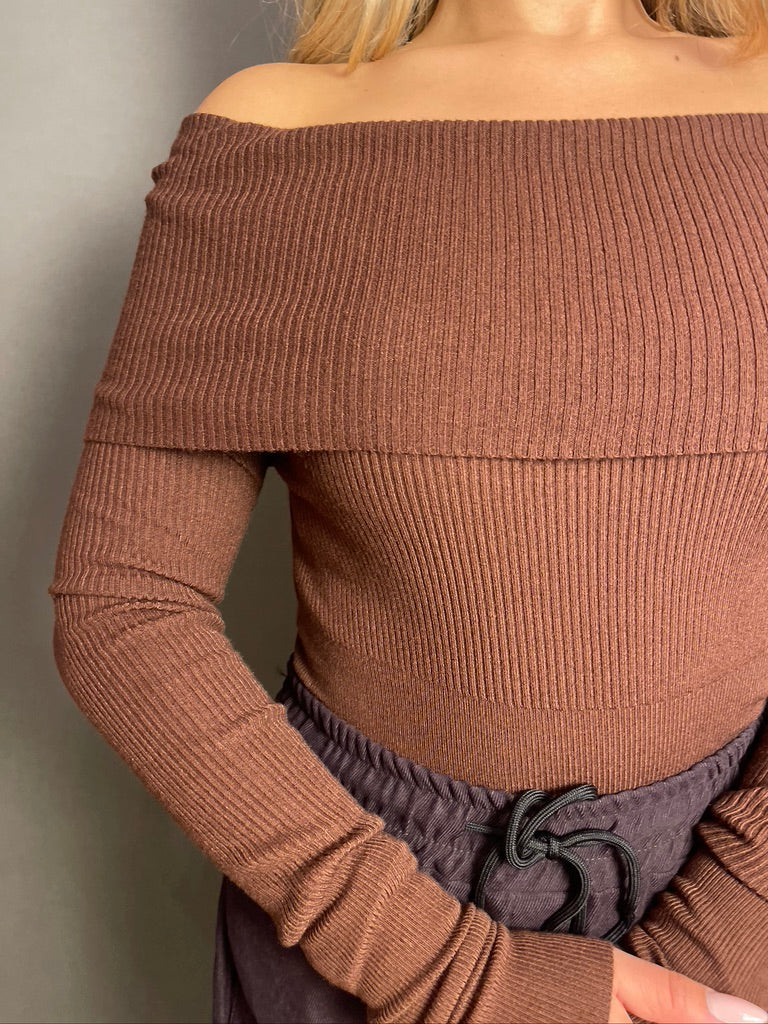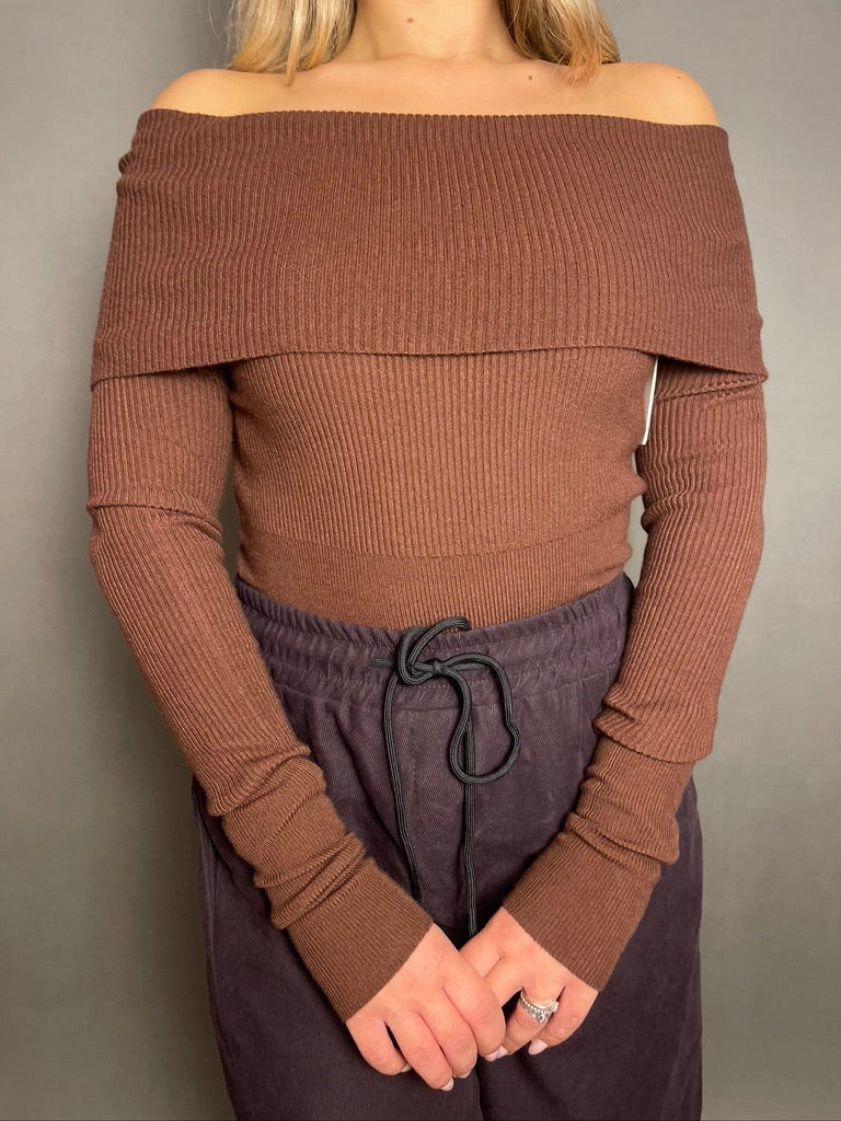 Il Maglioncino Stella unisce l'eleganza di una texture che richiama la lana con un design moderno a spalle scoperte a barca.