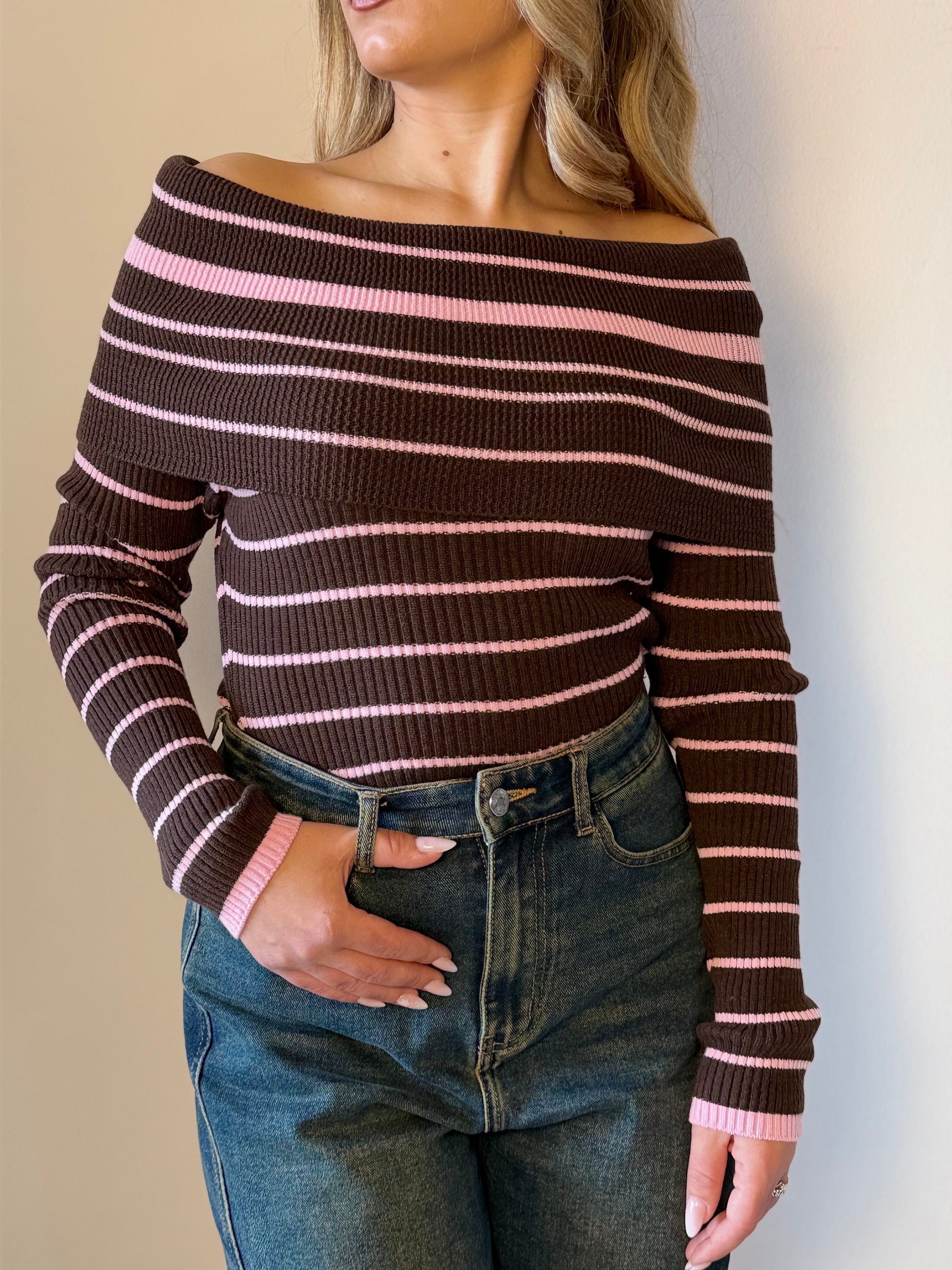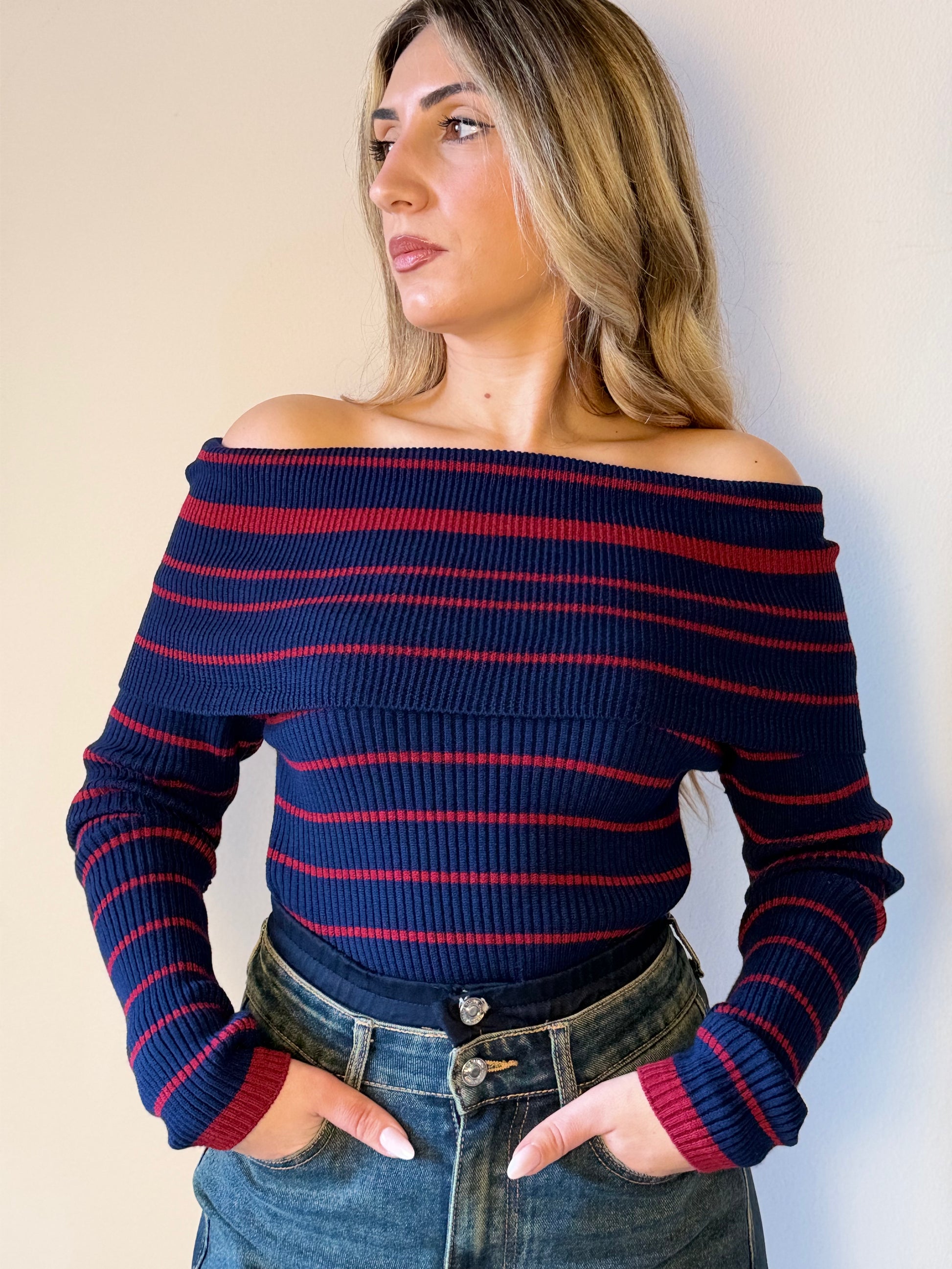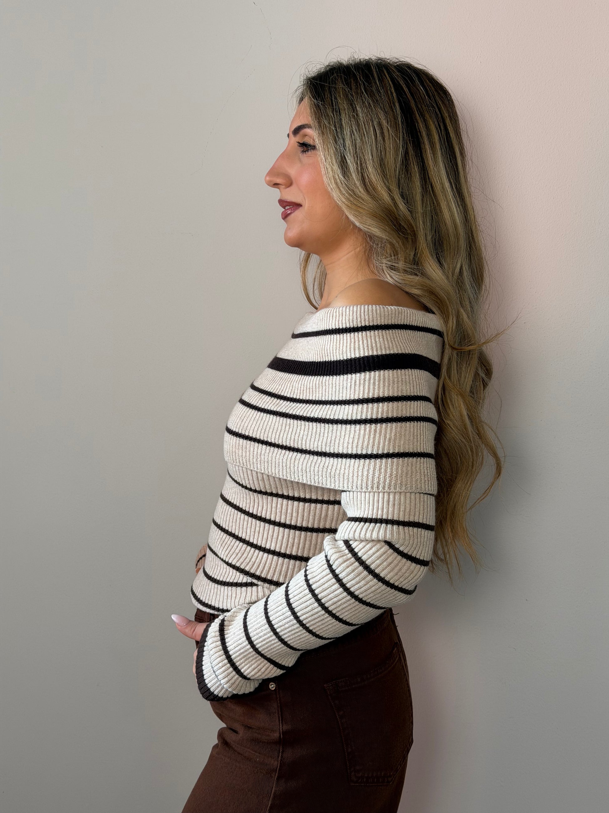 Maglione in maglia fine con scollo a barca e righe alternate blu e marrone.