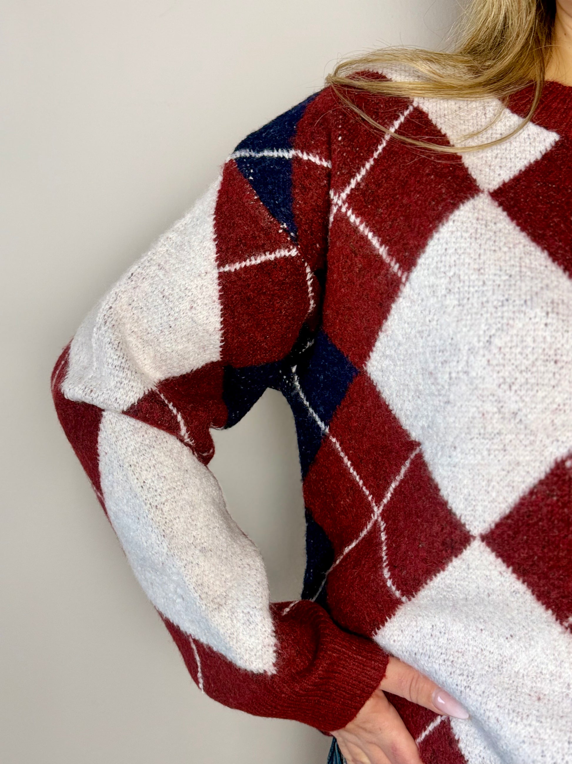 Maglione rombi super caldo a girocollo, vestibilità morbida.